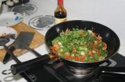然后,加入芥菜,翻炒。