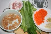 材料料:芥菜、虾皮(事先泡水)、三层肉、大米(先浸泡一个小时)、姜蒜切成末、胡萝卜也切成末(改良加进去的,一般是没有的)。