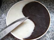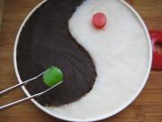 将调好芋头泥和红豆沙馅码入盘中,码成太极图形,用刀抹平。