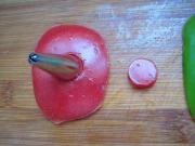 用小号裱花嘴在西红柿皮和青椒上刻出小圆形。