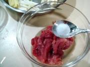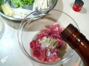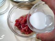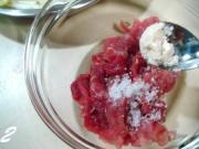 浆制肉丝;里面放盐1克、白糖1克。