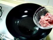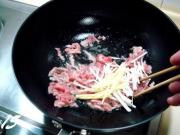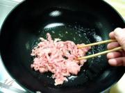肉丝打散后尚未变色,放入葱姜丝煸炒。