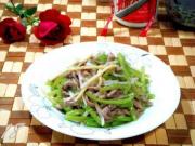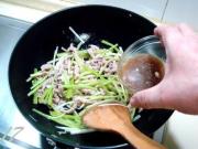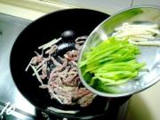 炒至肉丝变色后倒入笋丝、青椒丝用大火翻炒两下,使之升温。