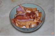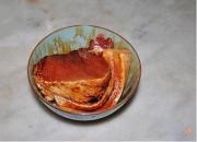 将摊凉了的猪肉切成片,放入碗里面压紧。上面放炒好了梅干菜。加入少许的料酒。