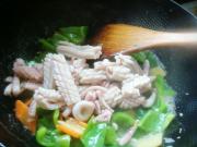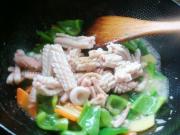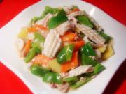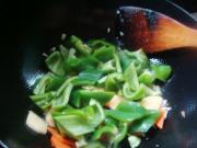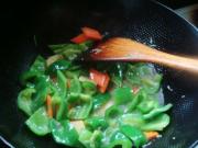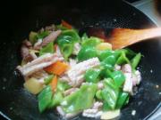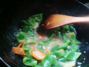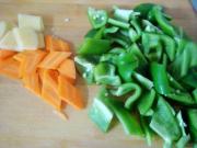 青椒去蒂、籽,洗净,切菱形,土豆去皮,切成片状, 胡萝卜洗净,切成片。