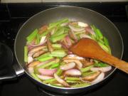 起油锅,将冬菇、香芹、香葱、洋葱煸香。