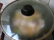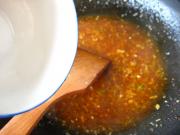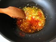 再加入酱油、辣椒粉、1大勺料酒、虾米碎、白糖、香醋、胡椒粉、清水烧开,下鸡精,淋入香油调味。