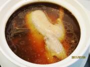 把鸡放入汤锅,撇浮沫后,其他材料全部放入,转小火煮1小时。