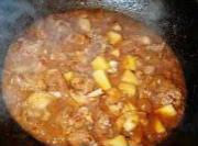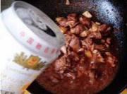 放入所备香料和老抽酱油、倒入整瓶啤酒,加入一碗清水中火炖20分钟左右,放入切小块的土豆。