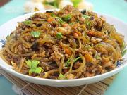 等水分将干时将粉丝和肉末炒匀,撒上芹菜叶末即可。