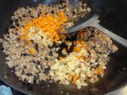 炒至发白时加入葱姜末及胡萝卜丁翻炒。