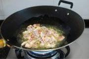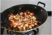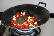 再将干辣椒和花椒下锅,炒至出香辣味。
