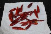 先将干辣椒洗净后,用纸巾吸干水分再用剪刀剪成段。