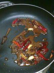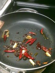 然后把锅烧热煸炒姜蒜辣椒和花椒