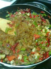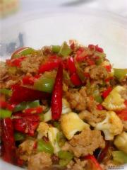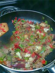 然后把肉末放进去炒到变色把青红椒,花菜倒进去。