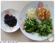 鸡在泡冰水的同时,来准备等下的调料:黑芝麻(我炒过了)、蒜末、葱花、花生(稍微碾碎)、香菜。