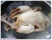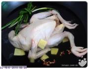 锅里放水,将整只鸡和葱、姜片一起放下去,煮开。