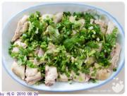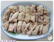 将在冰水中冰好的鸡捞出,剁块。