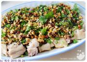 制作调料:红油、酱油、醋、蒜末、花生、芝麻、香油、盐混合。