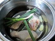 锅中加入适量的清水放入鸡腿,葱段,姜片。
