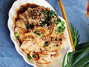 把调味汁浇在码好的鸡块上,再浇入辣椒油撒上熟芝麻和葱花即好。