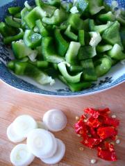 太空椒,大葱,干红辣椒切丁备用。