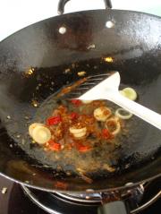 在原锅保留的油里倒入豆瓣酱辣酱大葱干红辣椒,用小火加热。