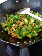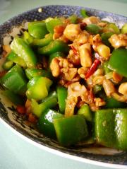 炒出香味后放入鸡丁回锅炒几下,淋入生抽,米醋,炒匀后放入太空椒再翻炒20秒钟即可。