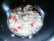 锅里放油,六成热放入花椒炸制上色,把花椒取出来。