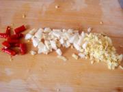 将辣椒切成两半、蒜切成丁。