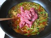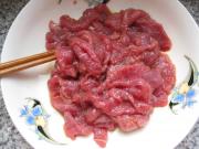 牛肉洗净,用刀背拍松,切片,加入适量酱油、料酒、水淀粉腌制10分钟。
