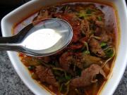 将煮好的牛肉连汤带菜倒入容器中,撒上干辣椒末和花椒粉。