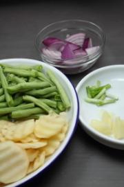 四季豆去经拆成段,土豆切片,洋葱切块,蒜切片,葱白切段