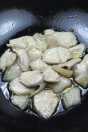 热锅少油煸炒猪肉,将肥肉中的油煎出来,肉稍微卷起即可,捞出待用
