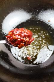 将刚才煎肉的底油烧热,下两大勺豆瓣酱翻炒出红油