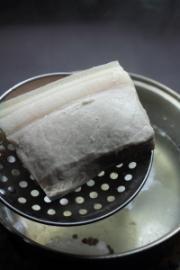 半肥瘦的猪肉放入锅中,加水没过,并放入花椒粒,中火煮至沸腾,小火煮3分钟,捞出洗净血沫