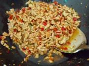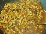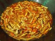 倒入其他配料,翻炒均匀,放生抽一汤勺,老抽半汤勺,糖两茶匙,兑高汤一碗。