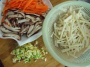 笋切丝焯水煮六分钟(腌笋处理方法),香菇胡萝卜切丝。葱姜蒜剁碎。