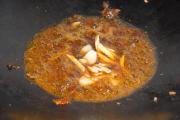 待火锅底料炒香后下姜丝和蒜片。
