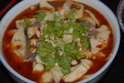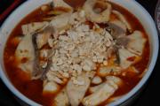 把煮熟的鱼片带汤一起倒入豆腐碗里,撒上花生碎。