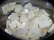 豆腐片加入 盐 花椒粉 孜然粉轻轻拌均。腌制10分钟。