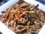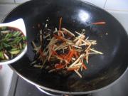 把葱姜蒜爆香后倒入黑木耳丝、胡萝卜丝和茭白丝炒匀炒透,再倒入调好的“鱼香汁”