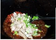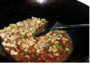 倒入鸡丁 花生米 葱段,翻炒。