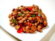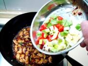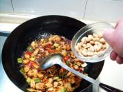 烹入碗芡炒匀,然后下入滑好的鸡丁用大火炒匀。