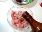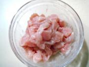 先把鸡肉切丁,里面放入盐、胡椒粉、鸡精和黄酒抓匀。