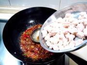 炒勺上火烧热,注入凉油滑散鸡丁,鸡丁五成熟捞出备用。