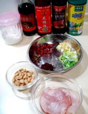 鸡胸肉、油炸花生米、红绿椒各、葱丁、姜片、小干辣椒、花椒、郫县辣酱、酱油、香醋、白糖、鸡粉、盐、胡椒粉、黄酒、水淀粉、花生油。