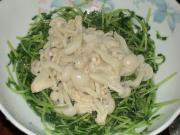 先把豆苗加点盐巴炒一炒 美白菇可用炒的 也可以用水烫熟 放在大碗底备用。