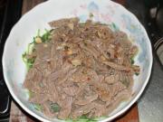 先把香菜段放在剛才的配菜上 牛肉煮至8分熟 铺在配菜上面 加入适量的汤。