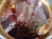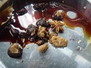 将红糖、酱油以1:1的比例放入锅中,加入小茴香一撮、香叶1片、八角2粒,小火继续熬。